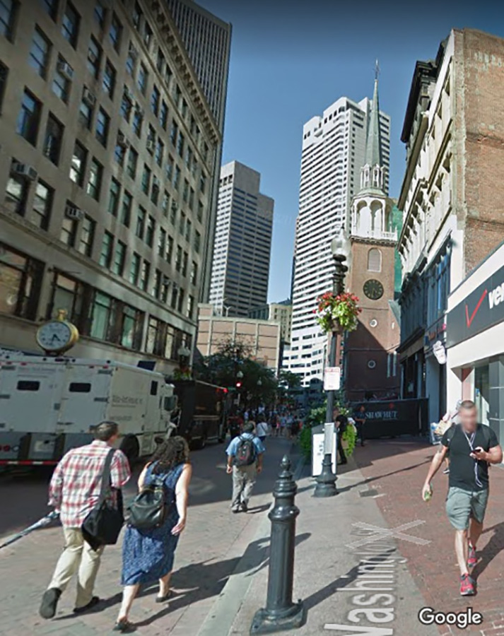 I think this image is my favorite of this post. The Old South Meeting House looks lovely with the climbing ivy present on the building, but it also shows a trolley car going down Washington Street on the right and a street clock on the left. For comparison, I took an image from Google Maps of the present state of Washington Street facing the Old South Meeting House and the clock, although updated, is still in that same spot!