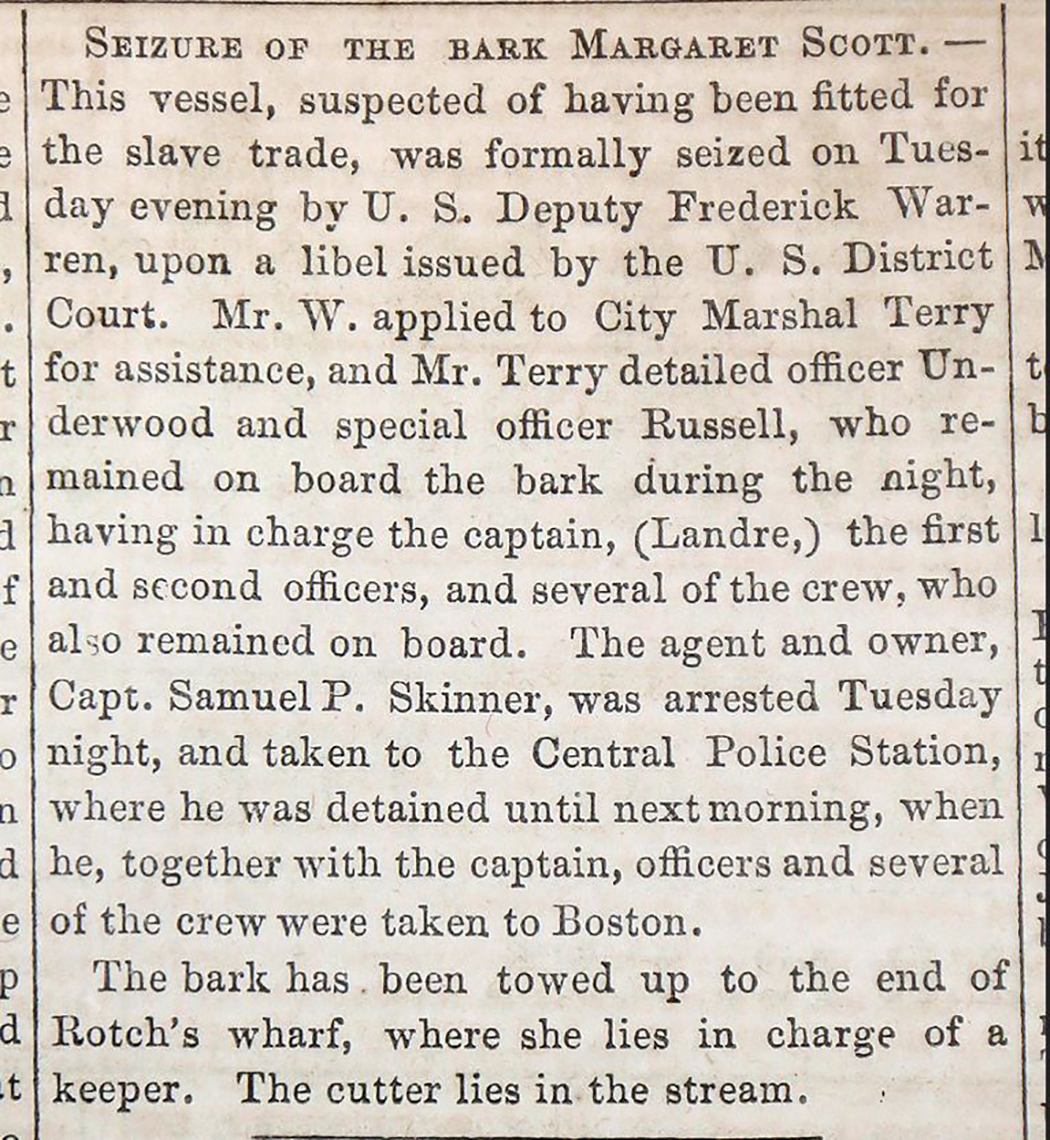The Margaret Scott had been confiscated at New Bedford a few days before and its captain, officers, and owner arrested. According to newspaper articles published at the time, ships loaded up with excessive amounts of water and dry crackers aroused suspicion, as this was recognized as the fare of enslaved people. Sailors got whiskey and bread.