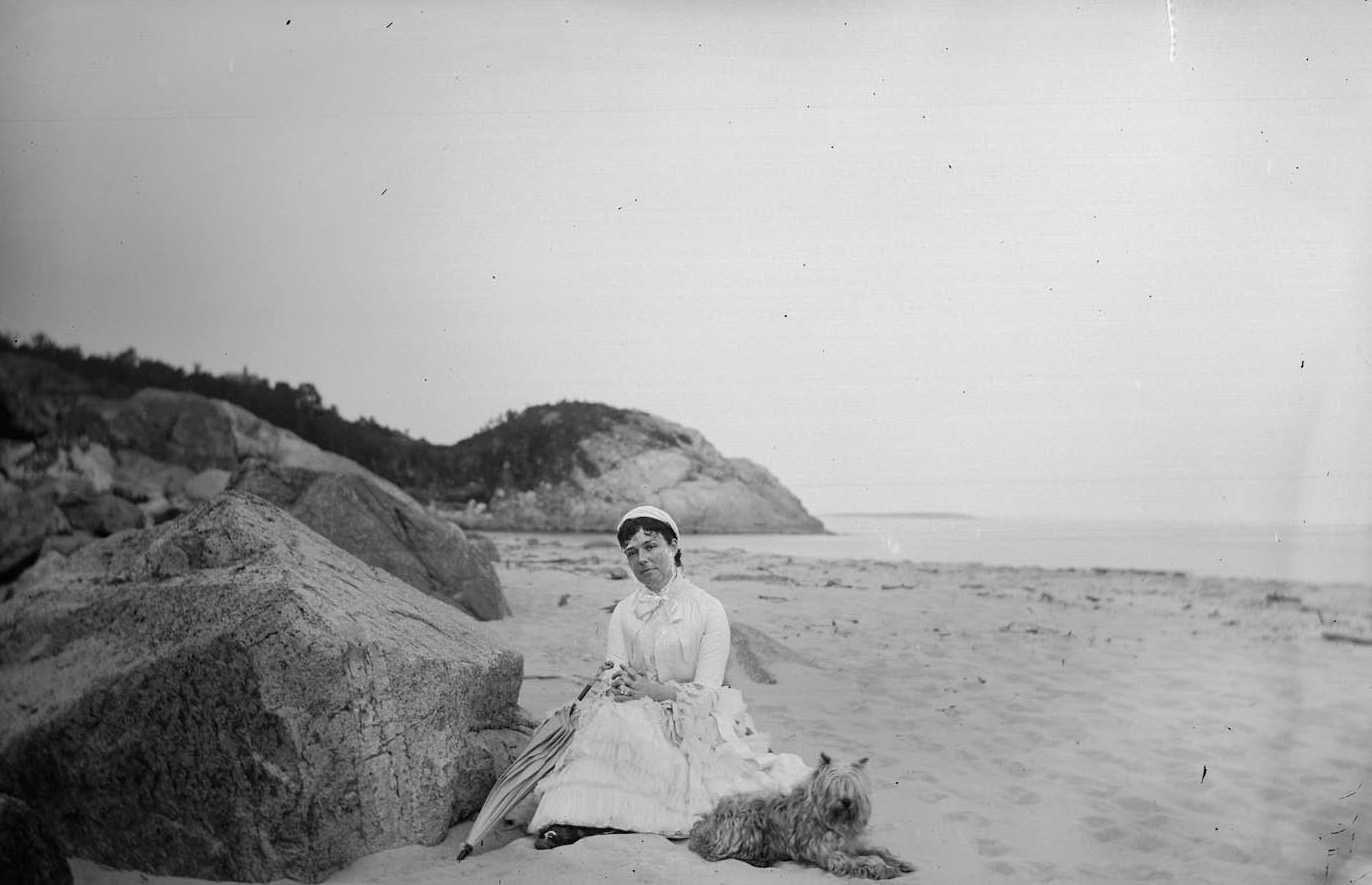 This image is from a glass plate negative, displayed in positive as the printed portrait is much more difficult to see. The subject of this portrait, Boojum, is seen quite clearly at the feet of Mrs. Jim Scott, a neighbor who came along for a day at the beach.