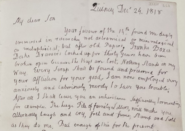 In December 1818, the bereaved patriarch and his grandson embarked on a project that thrills the heart of this editor. The two Adamses tore Peacefield apart in search of family papers. “Trunks Boxes Desks Drawers locked up for thirty Years have been broken open because the Keys are lost. Nothing Stands in my Way. Every Scrap Shall be found and preserved.”