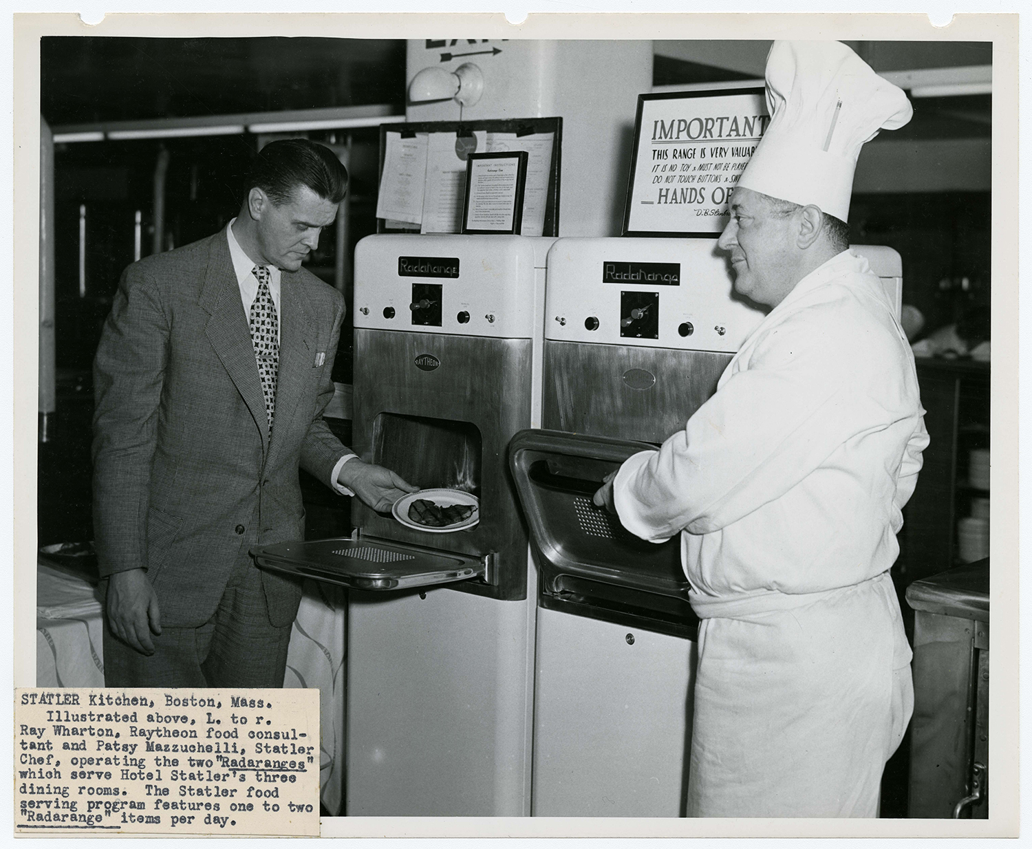 The chairman of the board of Hotels Statler Co., quoted in a press release, said that the Radarange “has a definite place in the preparation of quality food in quantity production. The cooking is not only fast, it is clean—there is no grease, smoke or odor. Our chefs, furthermore, are delighted because ‘Radarange’ produces no external heat, making the kitchen a more comfortable place in which to work.”