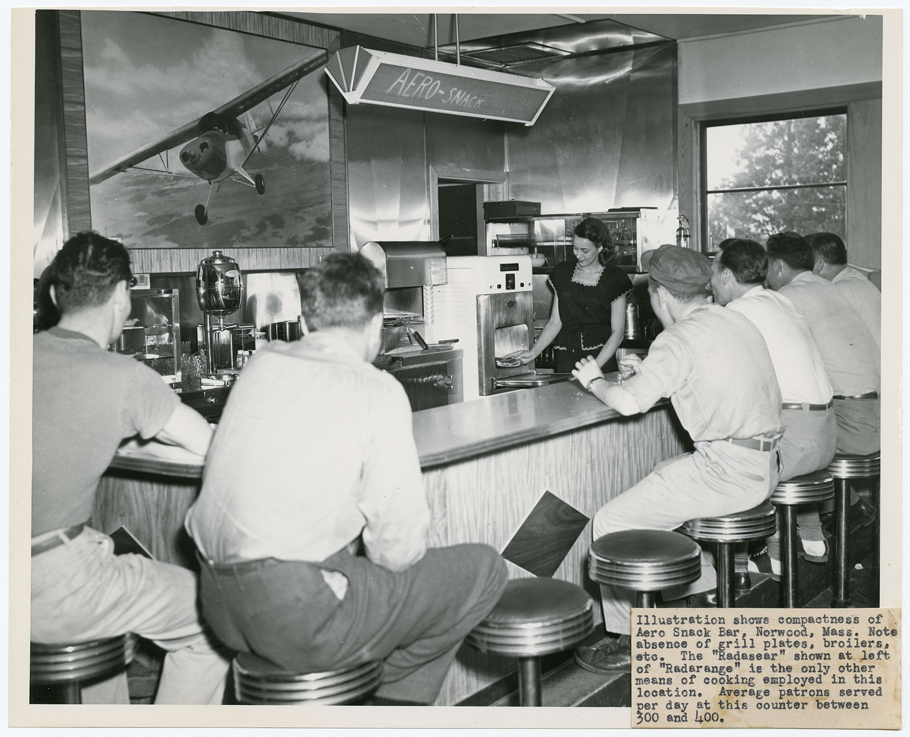 The scrapbooks include some fun promotional photographs featuring the Radarange at the Statler and other Massachusetts locations, like the Aero Snack Bar, a lunch counter at the Norwood airport; White Tower Restaurant in Brookline Village; and United Farmers Dairy Store in Dorchester.