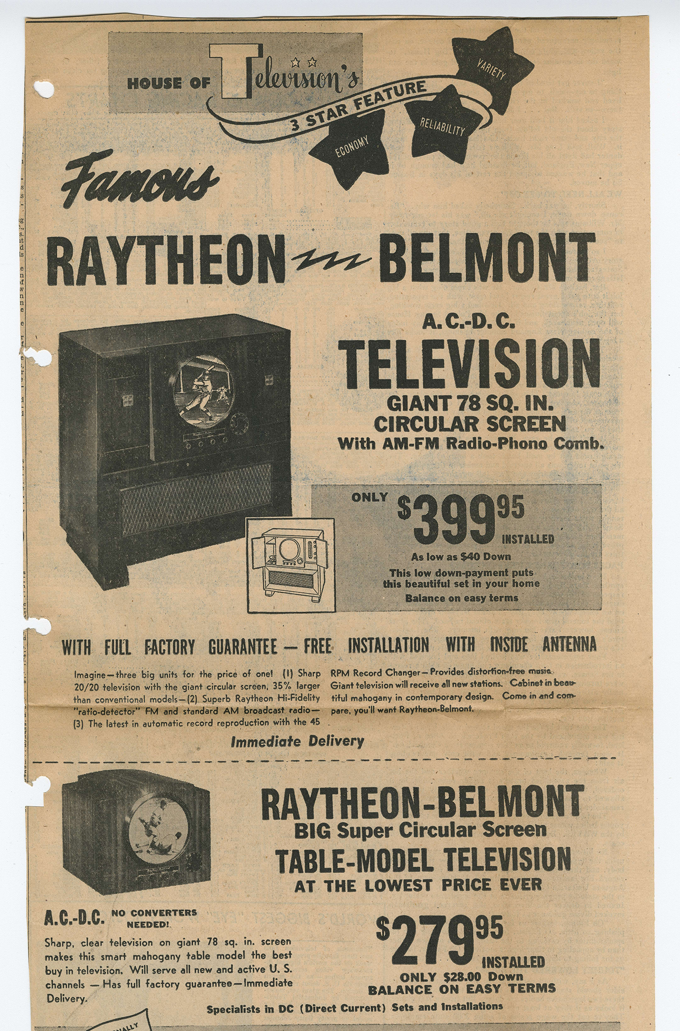 Television, on the other hand, had been around for a little while before Raytheon got in on the game. The company’s foray into the TV market wouldn’t last, but in the late 1940s, Raytheon and its subsidiary Belmont Radio Corporation were hyping their new model with features like a clearer picture, static-free sound, and a “snap-action station selector” (the channel dial, I assume). Prices of televisions advertised in Adams’ scrapbooks ranged from $200-$750. A store in Boston called the House of Television was selling a set that came in a mahogany cabinet with a AM/FM radio and a record player. It also boasted a “giant” circular screen…about 8.8 inches in diameter.
