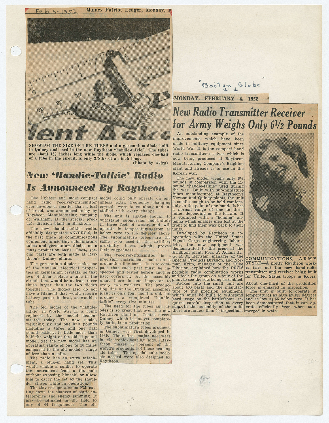 Last but definitely not least, I stumbled across these terrific clippings from the Quincy Patriot Ledger and the Boston Globe dated 4 Feb. 1952.They showcase Raytheon’s new “handie-talkie” radio, “the lightest and most compact hand radio receiver-transmitter ever developed,” weighing in at a mere 6 ½ pounds and larger than a woman’s head.