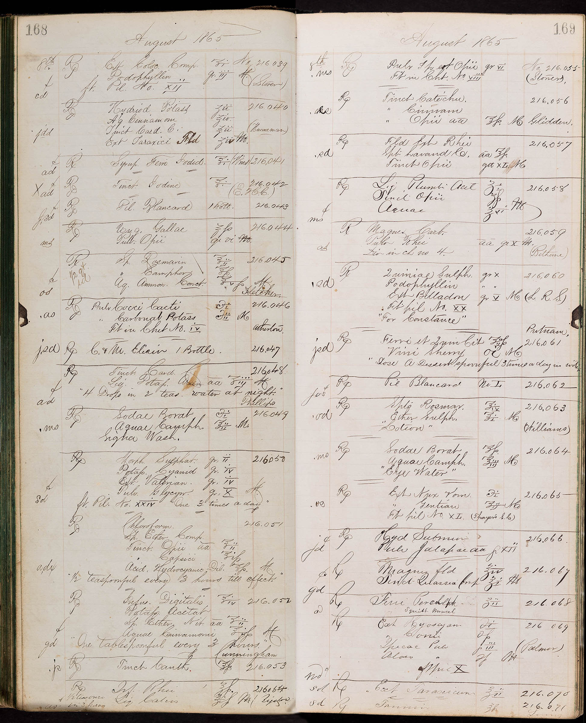 The apothecary of Theodore Metcalf & Co. was a Boston staple for decades. Founded by Metcalf in 1837 in the former house of Peter Faneuil at 39 Tremont Street, the pharmacy was patronized by untold numbers of the city’s residents in the 19th and early 20th century. The MHS recently acquired a fascinating volume listing thousands of daily prescriptions administered to Metcalf & Co. customers between 19 April 1865 and 5 April 1866.