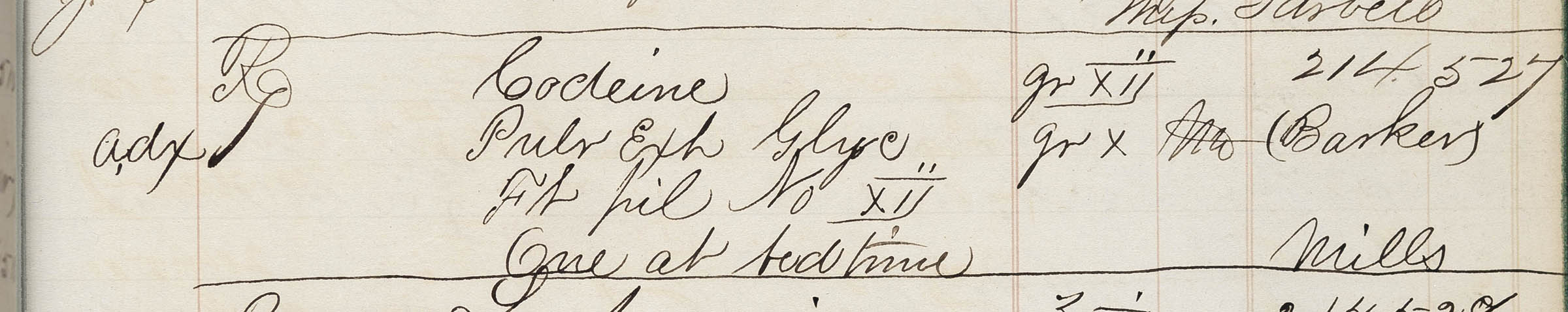 Other prescriptions include laudanum, potassium iodide, quinine sulfate, narceine, camphor, and Hooper’s Female Pills(!). (I’ll leave it to the experts to make inferences from these, but I admit I spent a little time researching what conditions these medications were used to treat.) A promotional booklet, cited in a later article, touted Metcalf & Co.’s role in introducing to the American public “the four inestimable boons to humanity, chloroform, cocaine, ether, and vaccine.”