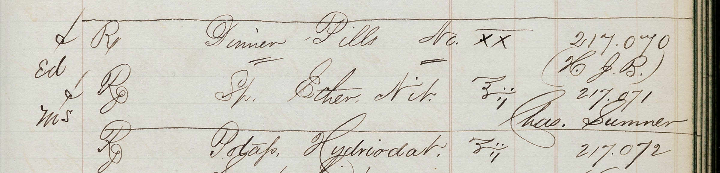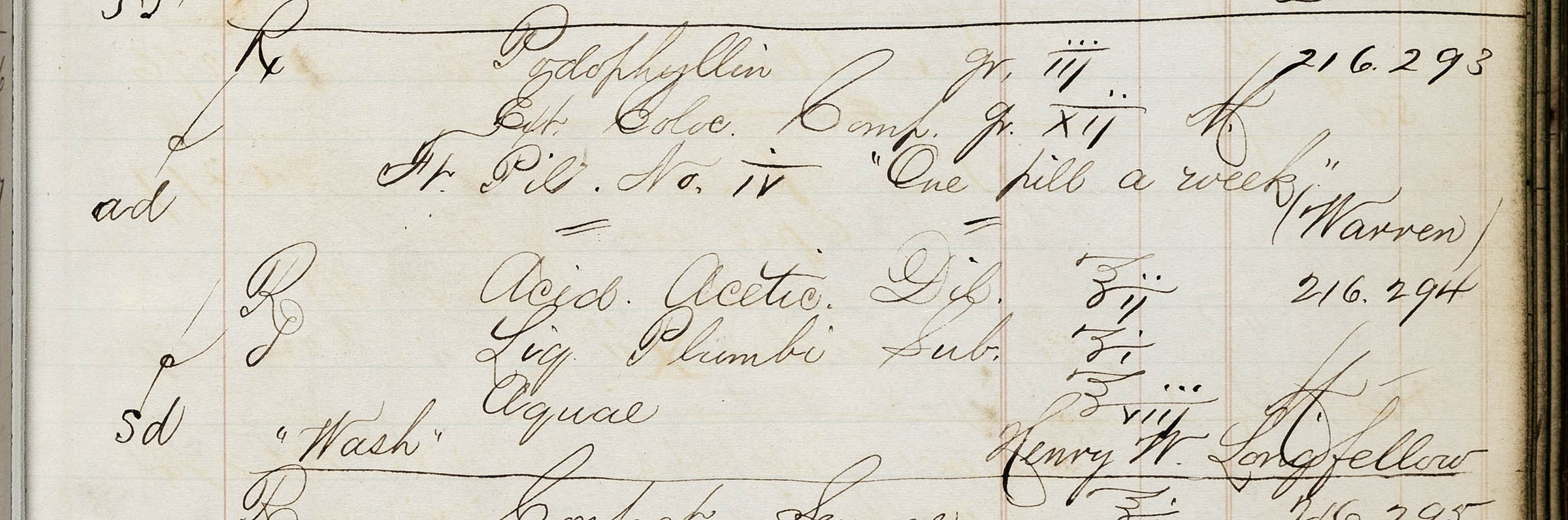 Some entries in the volume contain specific instructions, such as “To be rubbed behind each ear at night” or “One pill every second hour until the bowels are thoroughly moved.” Many, though not all, include the name of the prescribing doctor, a who’s who of the Boston medical establishment, as well as the name of the patient. Among Metcalf’s more recognizable customers were poet Henry Wadsworth Longfellow…