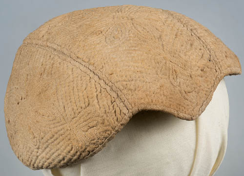 This christening cap is said to have been worn by Mather Byles (1707-1788) at his baptism in 1706. The skull cap with v-shaped edge over the forehead is constructed in three sections of cotton plain weave lining under finer cotton plain weave outer fabric. Quilted with cotton thread, each section has centered 8-petaled flower with stem and leaves at each front edge and parallel lines quilted around them; each is bound around the exterior with same cotton as the lining.