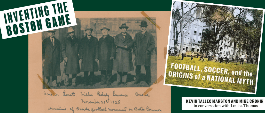 The MHS collection contains little-known treasures from the beginnings of football, from correspondence to commemorative medals. In an exciting talk, Kevin Tallec Marston and Mike Cronin will reveal Boston's founding role in US sporting culture and share the MHS collections that informed their new book. This program unveils the back story of the Oneida Football Club and its "Boston game"—an early version of soccer and football in the United States. The game developed as Boston was transforming from urban change and immigration in the 19th and 20th centuries. In conversation with Louisa Thomas, Marston and Cronin will examine the frontier between memory and history in early Boston sports and offer insight into how and why origin stories are created.
