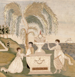 As the 18th century closed and the 19th century advanced, the images people chose for their memorial tokens softened. The stark reminders of death gave way to vignettes of loss and mourning—women in neoclassical robes wept at tombs,
