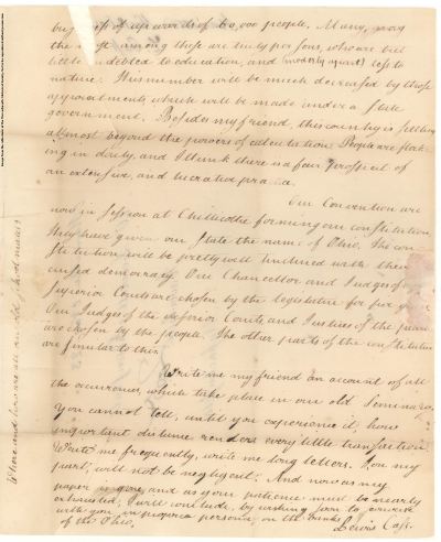 Cass studied law there, and was admitted to the Ohio bar in 1802. His letters to Saltonstall illustrate the difficulty of life on the frontier and offer descriptions of Indian mounds, rivers, and the surge of immigrants to the territory. The letters also discuss opportunities for lawyers in the west, political and social development of the territory on the eve of Ohio statehood, and the framing of the Ohio Constitution. In his letter of 12 July 1803, Cass states, "I should not wish to raise expectations, which may never be realized, but I sincerely think this is the best country in the world for a young man."