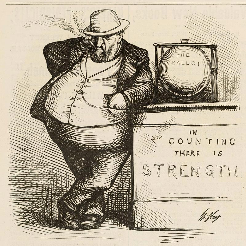 Many 19th-century cartoons focus on political corruption—ballot box stuffing and vote buying—as a bar to voting rights. Thomas Nast drew his most famous cartoons in the course of his sustained attack on the Tweed Ring, named for William Marcy Tweed, who ruled New York City from Tammany Hall. As caricatured by Nast, the Tweed Ring became the embodiment of political venality. He pictured “Boss” Tweed boldly leaning on a ballot box, which bears the inscription: “In counting there is strength.”