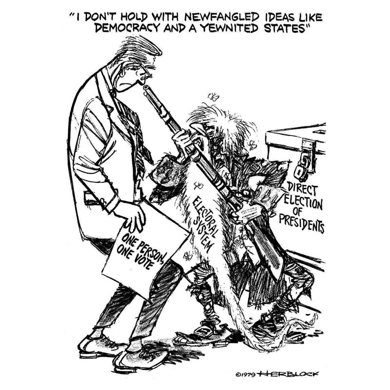 Herblock continued his crusade against the Electoral College throughout his long editorial career. In 1979,during a presidential campaign that ended in a landslide popular vote and Electoral College victory for Ronald Reagan, Block satirized voters who did not “Hold With Newfangled Ideas Like Democracy.”