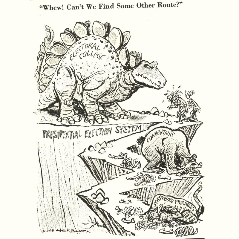 In editorial cartoons dating back to the extremely close 1960 presidential election, Herblock prophesied political disaster if the electoral vote was at odds with the popular vote. Every four years he would warn against burdens and obstructions that could prevent a fair presidential election, but always returned to the antiquated Electoral College system, portrayed here as a dinosaur blocking the tortuous path to the 1968 election.