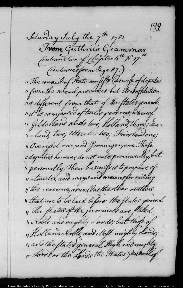 John Quincy Adams diary 4, 9 June 1781 - 27 August 1781, page 109