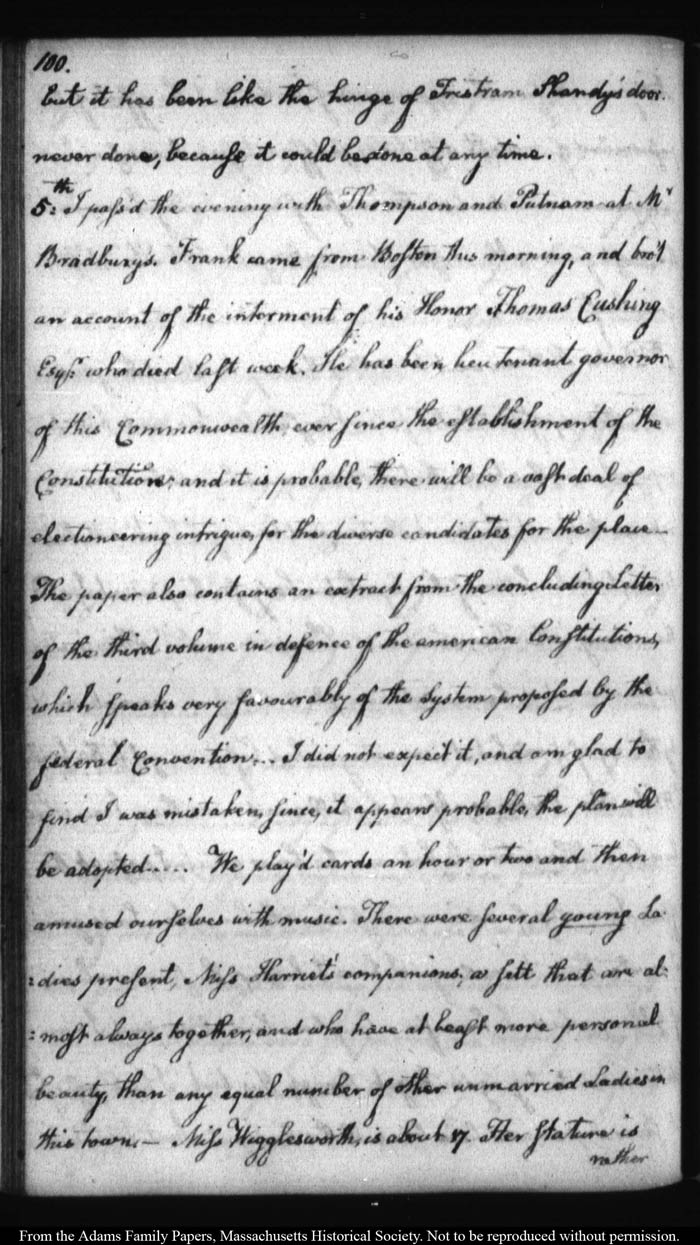 John Quincy Adams diary 12, 1 November 1787 - 17 September 1789 (with gaps); includes line-a-day entries 1 August 1788 - 31 December 1790, page 100