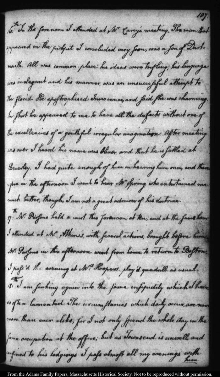 John Quincy Adams diary 12, 1 November 1787 - 17 September 1789 (with gaps); includes line-a-day entries 1 August 1788 - 31 December 1790, page 107