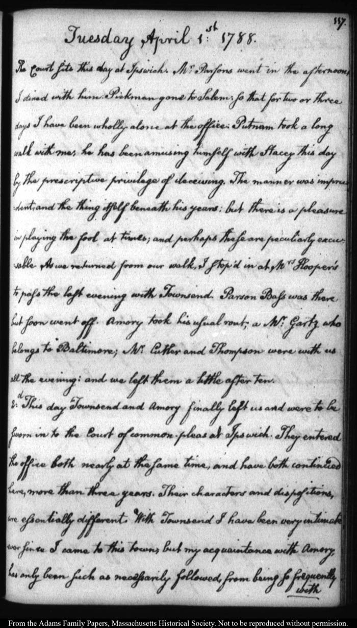 View full, authoritative transcriptions with page images of the diaries at John Quincy Adams Digital Diary part of the Primary Source Cooperative at the MHS.