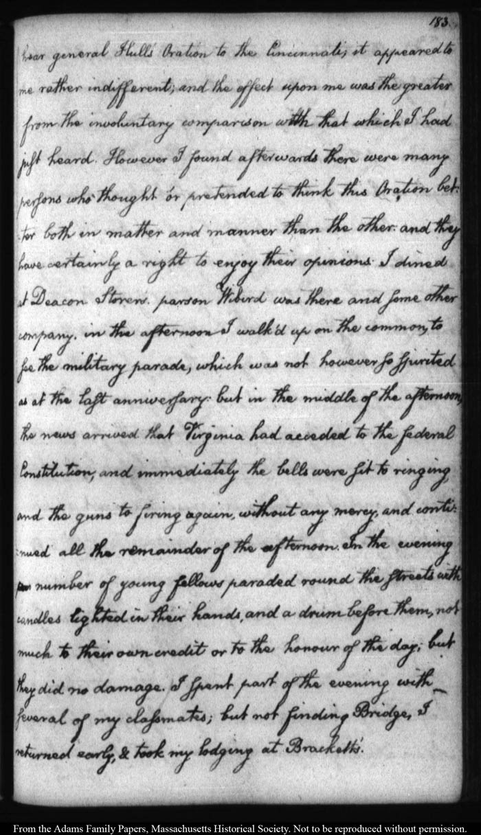 John Quincy Adams diary 12, 1 November 1787 - 17 September 1789 (with gaps); includes line-a-day entries 1 August 1788 - 31 December 1790, page 183