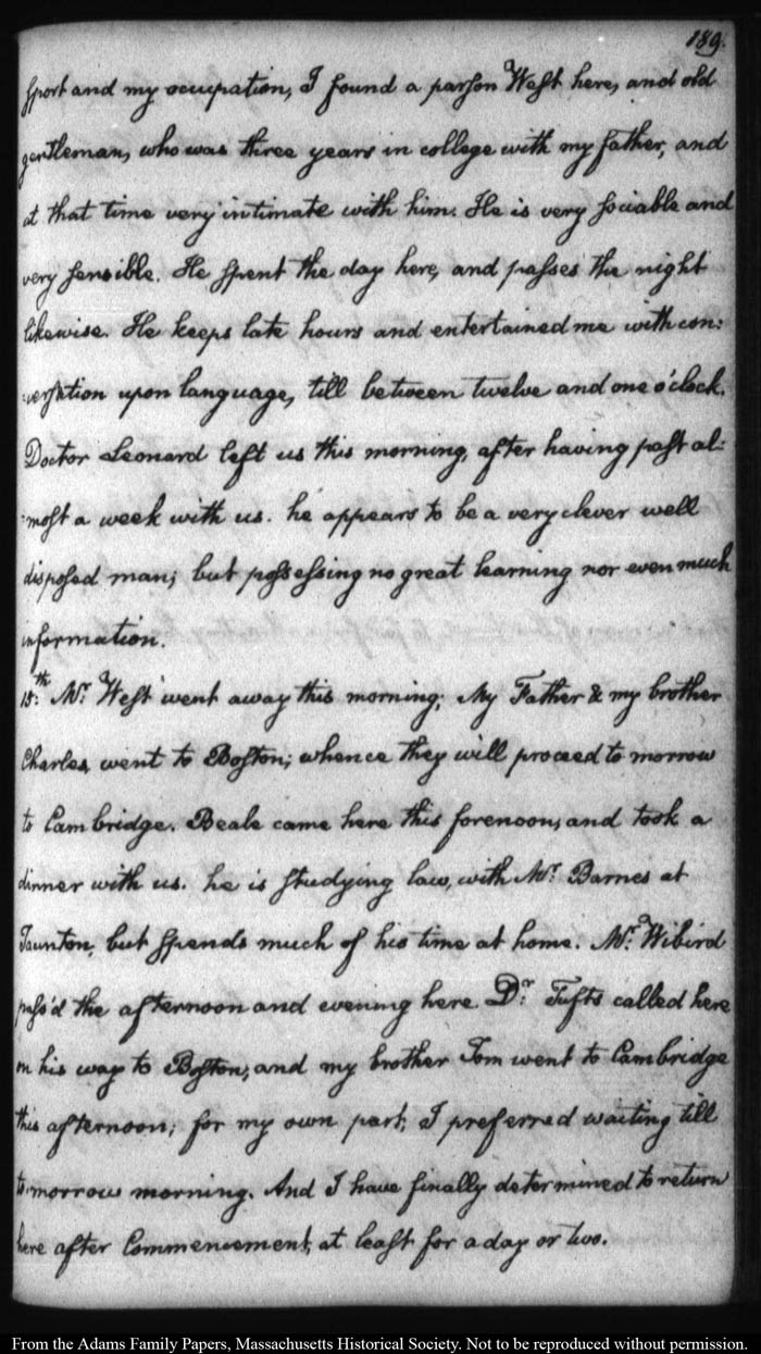 John Quincy Adams diary 12, 1 November 1787 - 17 September 1789 (with gaps); includes line-a-day entries 1 August 1788 - 31 December 1790, page 189