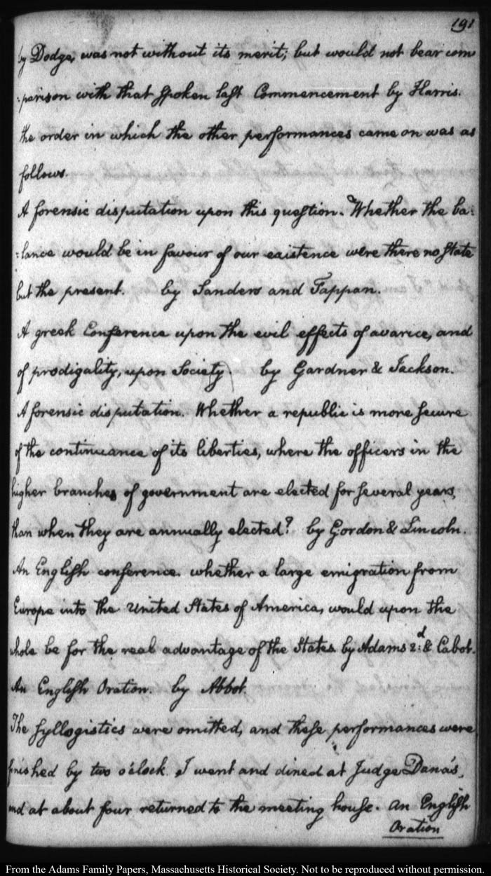 John Quincy Adams diary 12, 1 November 1787 - 17 September 1789 (with gaps); includes line-a-day entries 1 August 1788 - 31 December 1790, page 191