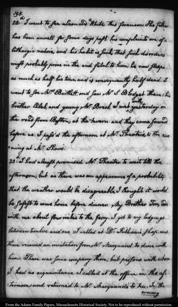 John Quincy Adams diary 12, 1 November 1787 - 17 September 1789 (with gaps); includes line-a-day entries 1 August 1788 - 31 December 1790, page 198
