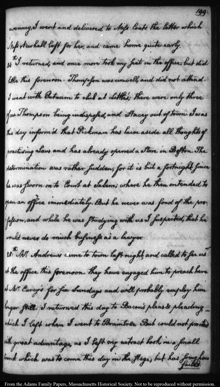 John Quincy Adams diary 12, 1 November 1787 - 17 September 1789 (with gaps); includes line-a-day entries 1 August 1788 - 31 December 1790, page 199