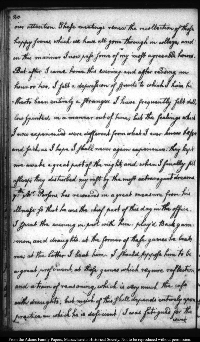 John Quincy Adams diary 12, 1 November 1787 - 17 September 1789 (with gaps); includes line-a-day entries 1 August 1788 - 31 December 1790, page 20