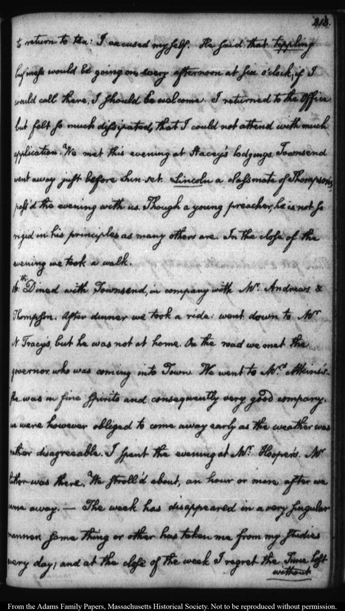 John Quincy Adams diary 12, 1 November 1787 - 17 September 1789 (with gaps); includes line-a-day entries 1 August 1788 - 31 December 1790, page 213