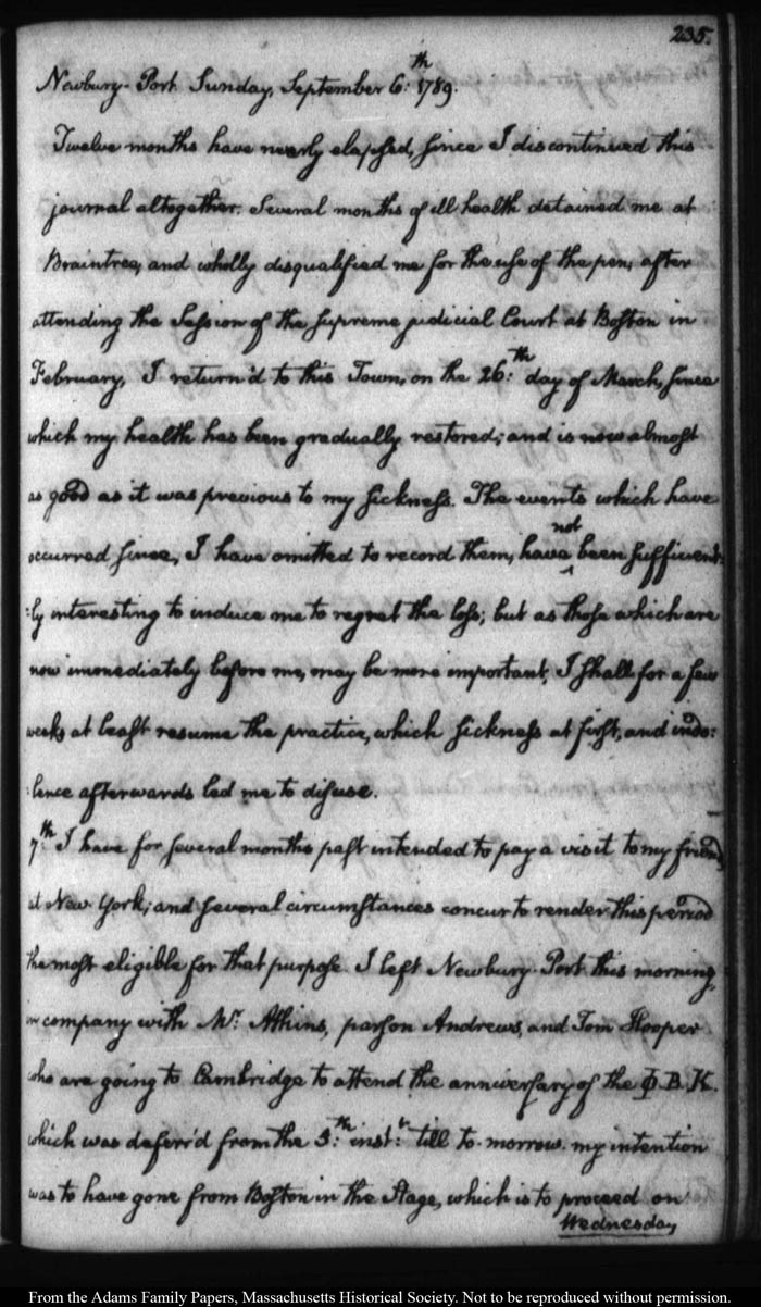 John Quincy Adams diary 12, 1 November 1787 - 17 September 1789 (with gaps); includes line-a-day entries 1 August 1788 - 31 December 1790, page 235