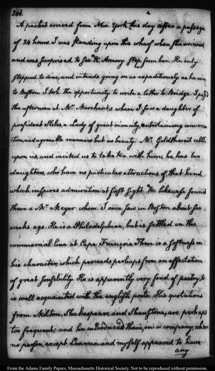John Quincy Adams diary 12, 1 November 1787 - 17 September 1789 (with gaps); includes line-a-day entries 1 August 1788 - 31 December 1790, page 240