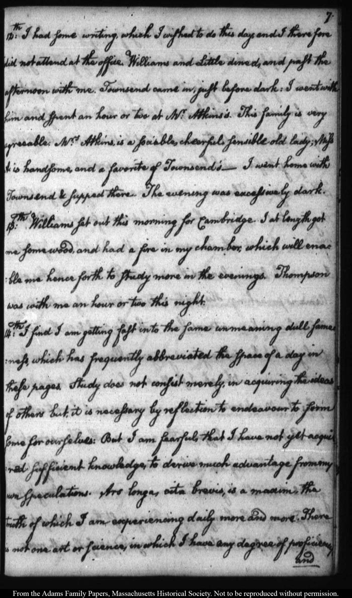 John Quincy Adams diary 12, 1 November 1787 - 17 September 1789 (with gaps); includes line-a-day entries 1 August 1788 - 31 December 1790, page 7