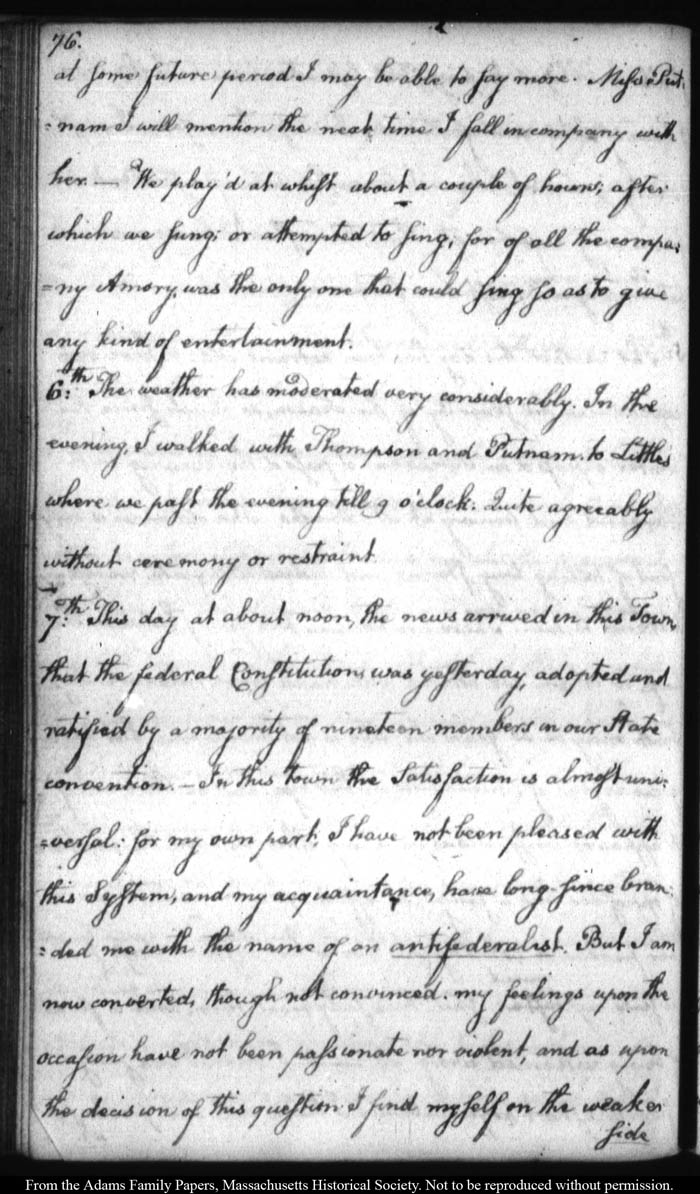 John Quincy Adams diary 12, 1 November 1787 - 17 September 1789 (with gaps); includes line-a-day entries 1 August 1788 - 31 December 1790, page 76
