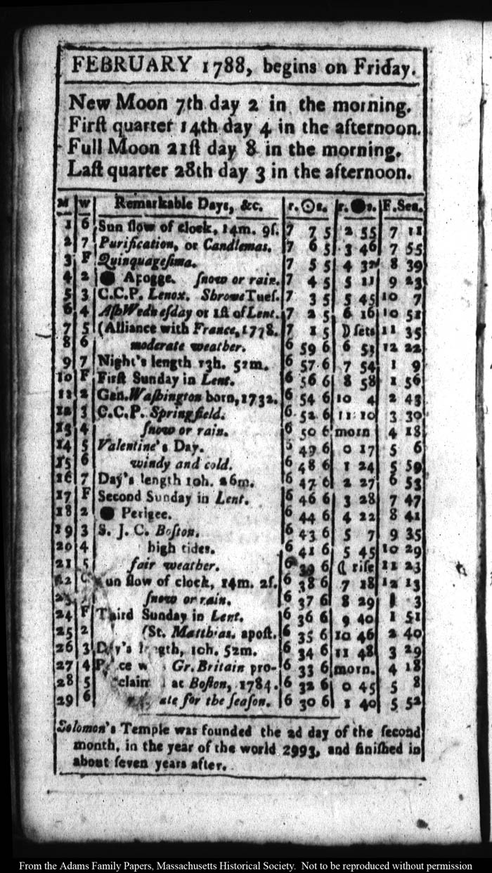John Quincy Adams diary 13 (almanac), 1788, 1