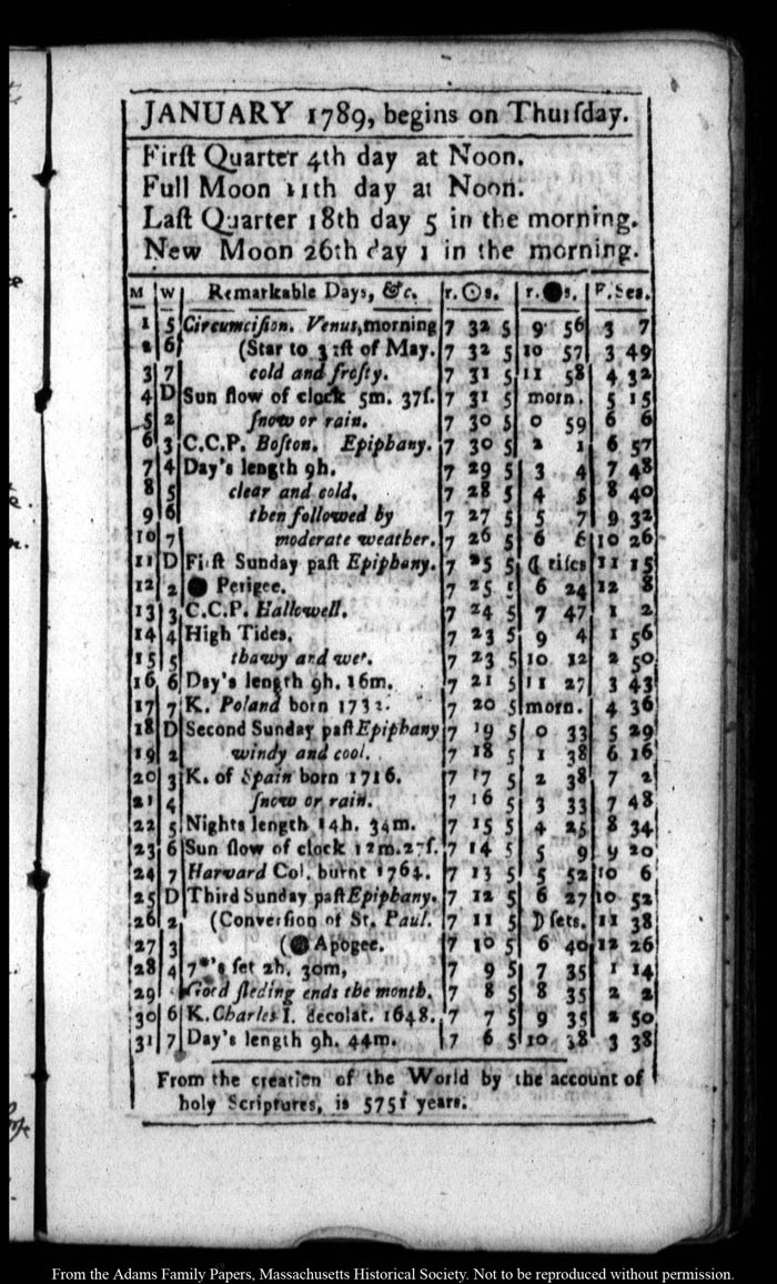 John Quincy Adams diary 14 (almanac), 1789, page 11