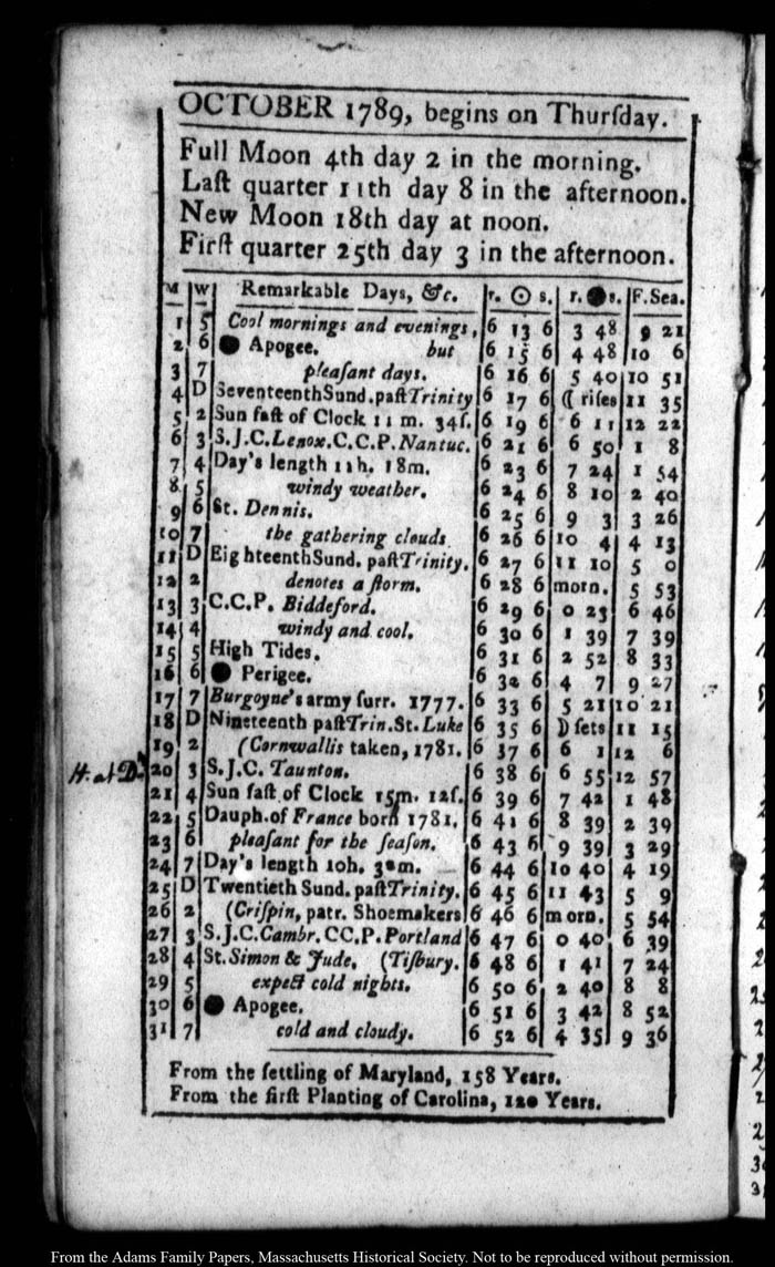 John Quincy Adams diary 14 (almanac), 1789, page 36
