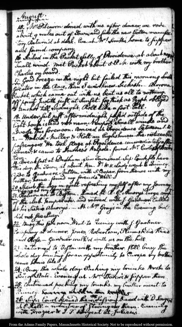View full, authoritative transcriptions with page images of the diaries at John Quincy Adams Digital Diary part of the Primary Source Cooperative at the MHS.