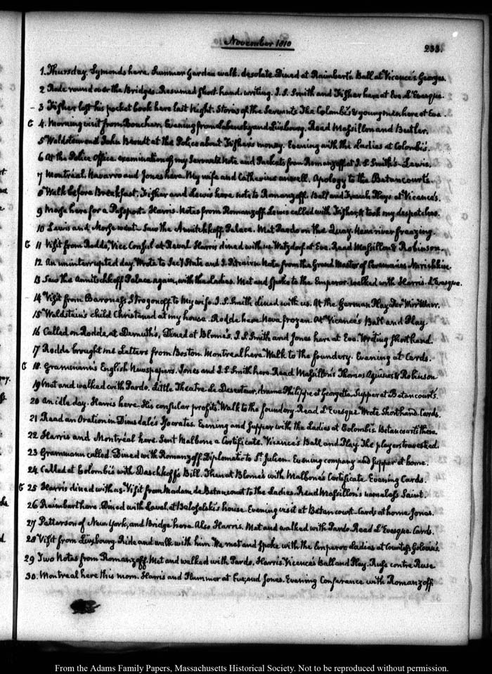 Office. examination of my Servants. Note and Packets from Romanzoff. at J. S.
