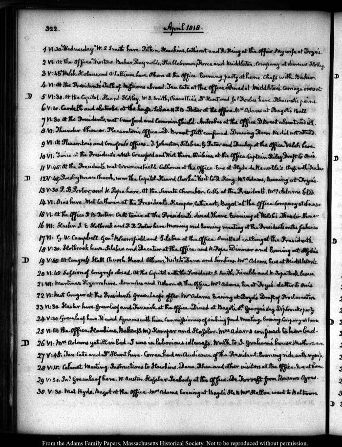 V:30. Met Hyde. Bagot at the Office. Mrs Adams, Evening at Boyd’s. He & Mrs Hellen went to Baltimore