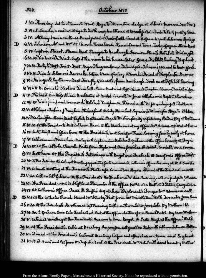 V:30. At the President's. He returned last Evening. Calhoun there. Letter from John. My Mother ill.