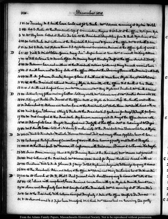 VIII:15. At the President’s. Mrs Monroe ill. Conference with Pedersen Dinner at Calhoun’s. The Bagot’s.