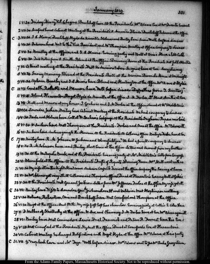 VI: Jackson here, declines going to the Havanna. At the President’s. At Calhoun’s Office. Bailey & Forbes here at Eve