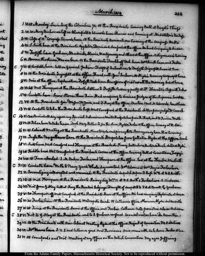 VI:45. Twice at the President's. Lewis at the Office; and Forbes. Calhoun. Note from Onis. Asks an Audience—