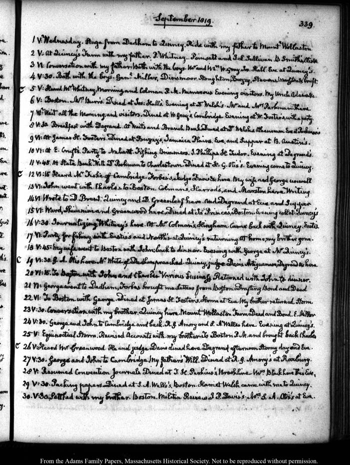 V:30. Journalizing. Whitney’s here. At Mr Colman’s, Hingham. Came back with Quincy. Eustis.
