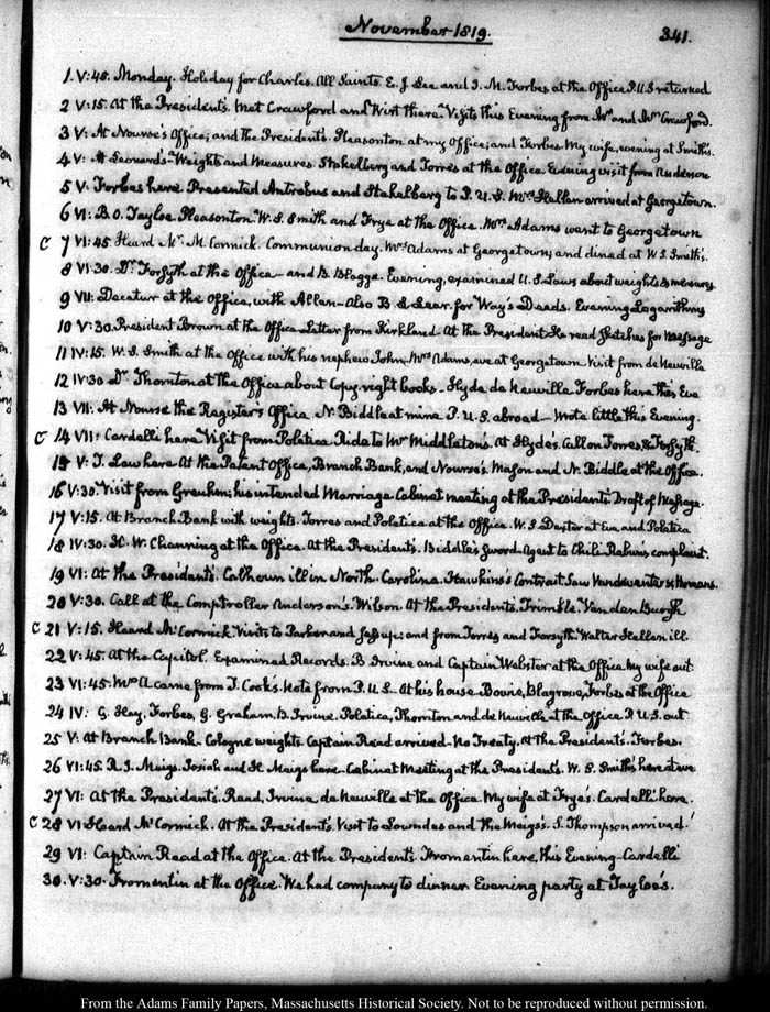 VI:45. Heard Mr. M'Cormick. Communion-day. Mrs. Adams at Georgetown; and dined at W. S. Smith’s.