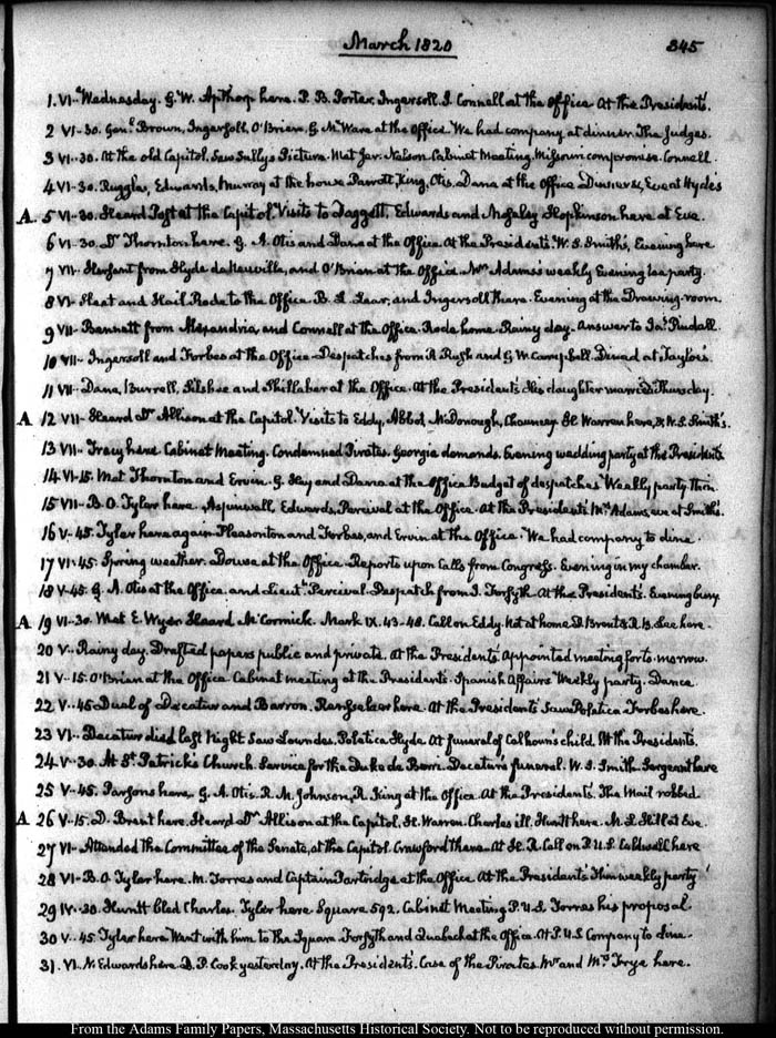 VII: B. O. Tyler here. Aspinwall, Edwards, Percival at the Office. At the President's. Mrs: Adams eve at Smith's.