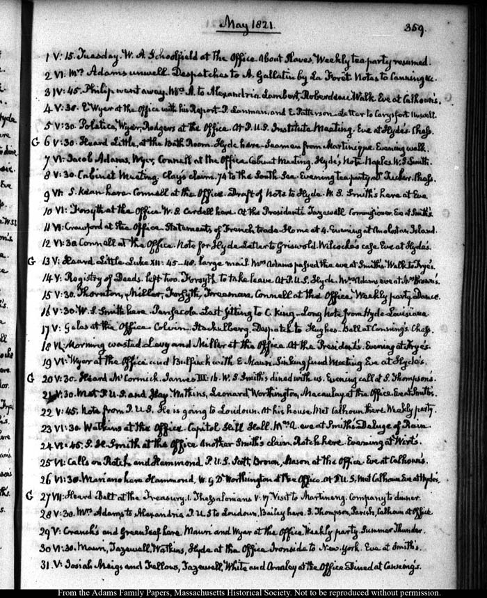 V:30. Mrs. Adams to Alexandria. P.U.S. to Loudoun. Bailey here. S. Thompson, Parish, Calhoun at Office.