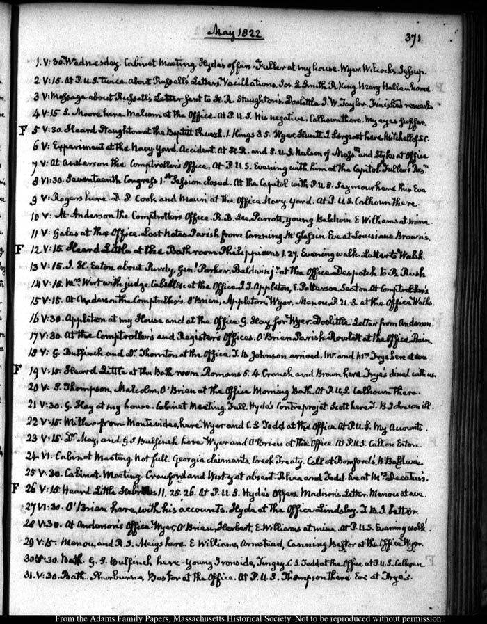 V:30. Cabinet-Meeting. Crawford and Wirt yet absent. Rhea and Todd. Eve at Mrs. Decatur’s.