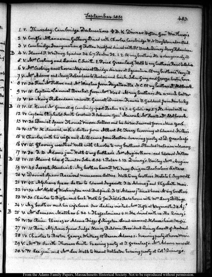 View full, authoritative transcriptions with page images of the diaries at John Quincy Adams Digital Diary part of the Primary Source Cooperative at the MHS.