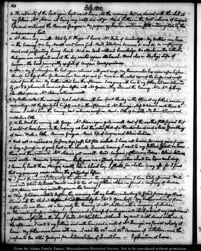 View full, authoritative transcriptions with page images of the diaries at John Quincy Adams Digital Diary part of the Primary Source Cooperative at the MHS.